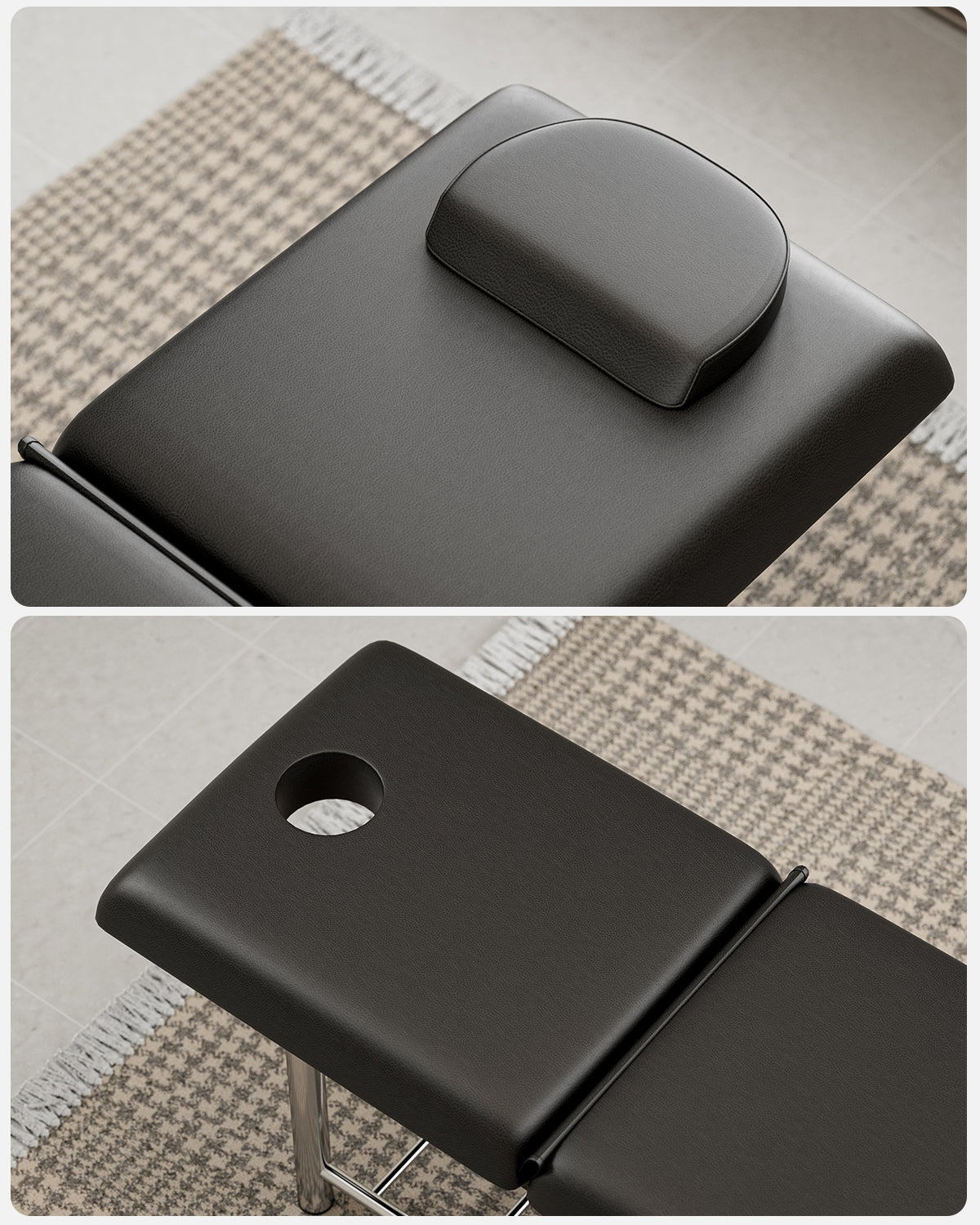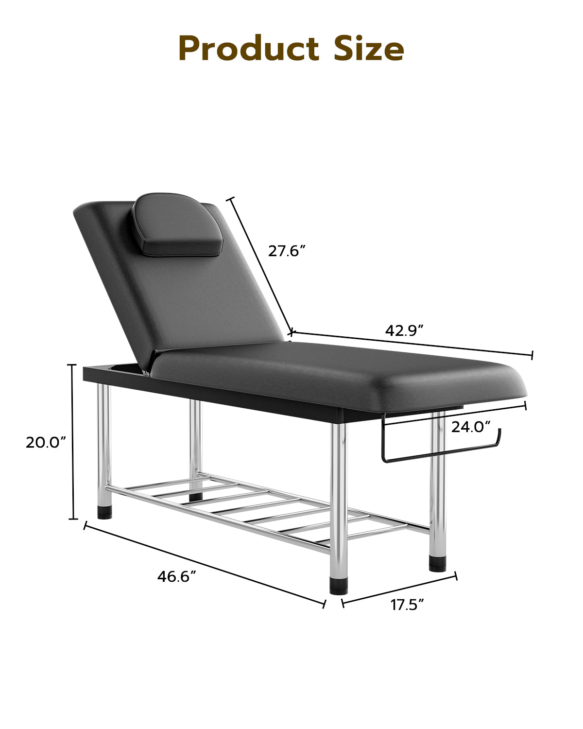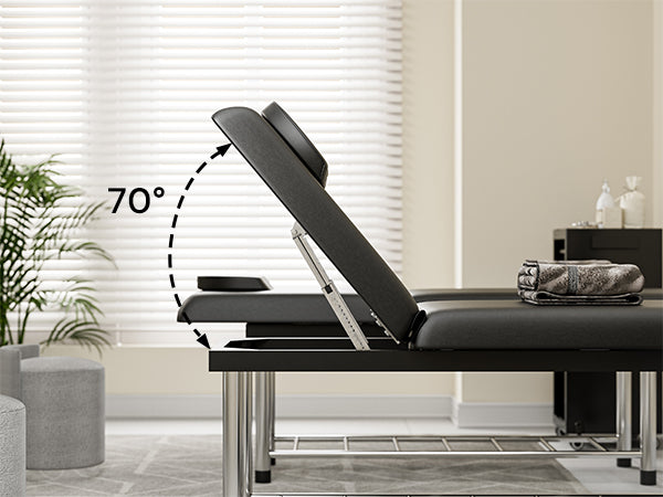 Ajustable y ergonómico: El respaldo se ajusta fácilmente a un ángulo cómodo según las necesidades del cliente y el procedimiento de belleza. El ángulo máximo ajustable es de 70°. El respaldo de 61 cm de ancho y su ángulo ajustable se adaptan a la curva del cuerpo, ideal para clientes que buscan tratamientos terapéuticos o deportivos.