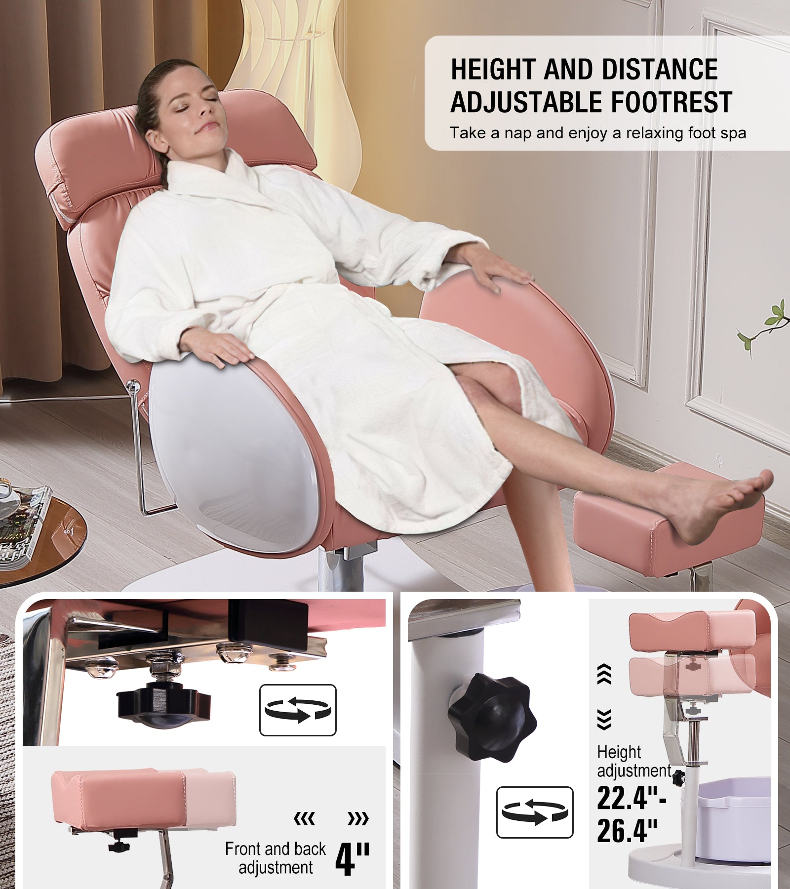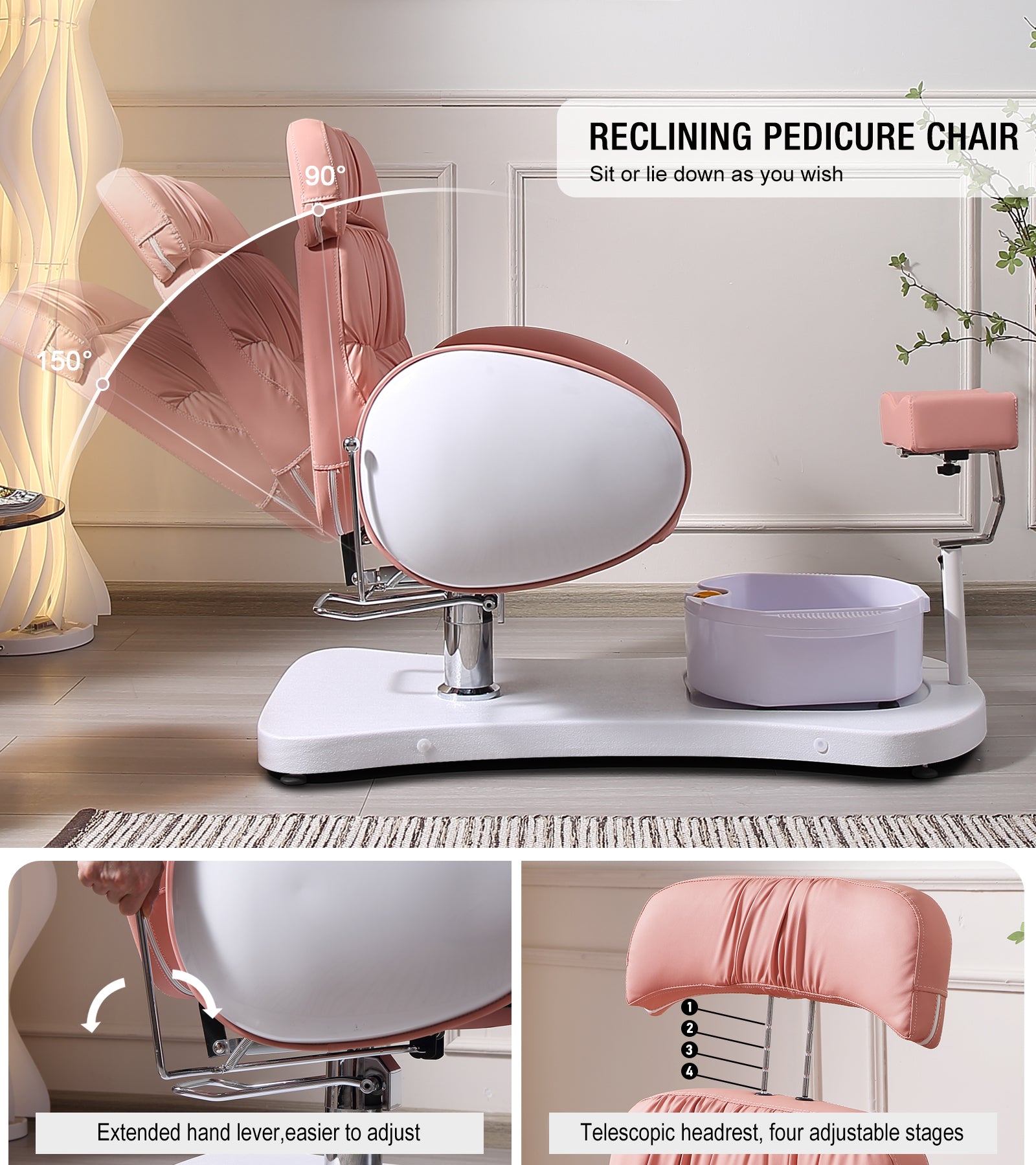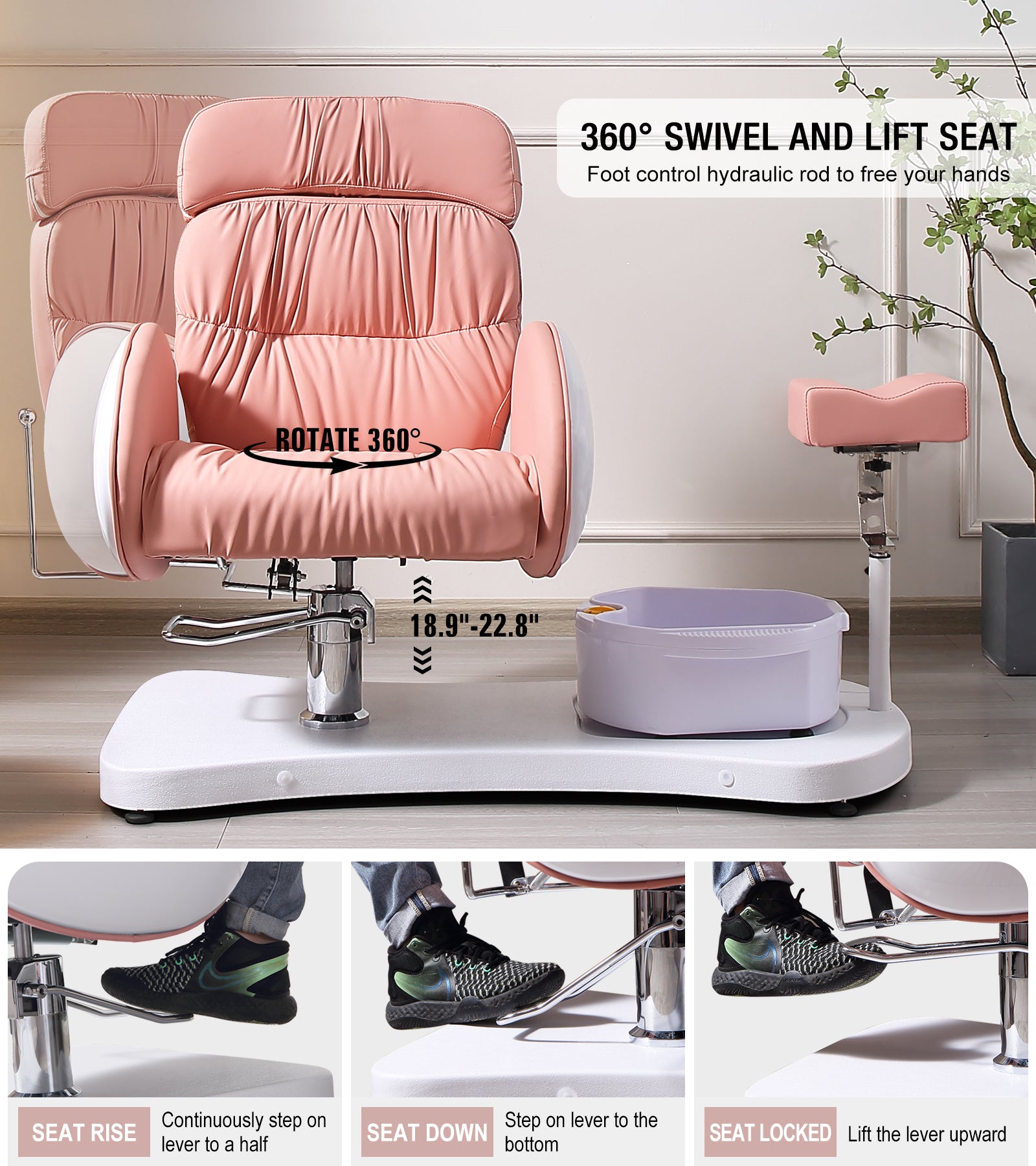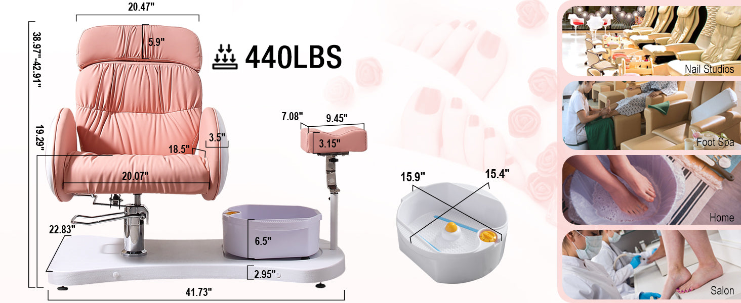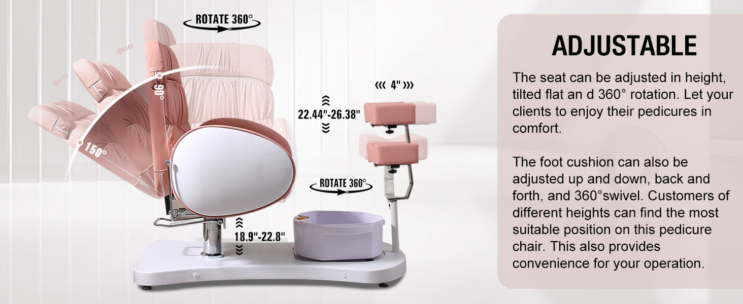 - Flexible Adjustment: The backrest can be lowered and headrest can be freely retractable. 360° rotation hydraulic lift chair seat makes multiple posture options available . Angle and distance footrest allows every height customers to find a comfortable position on this pedicure chairs unit