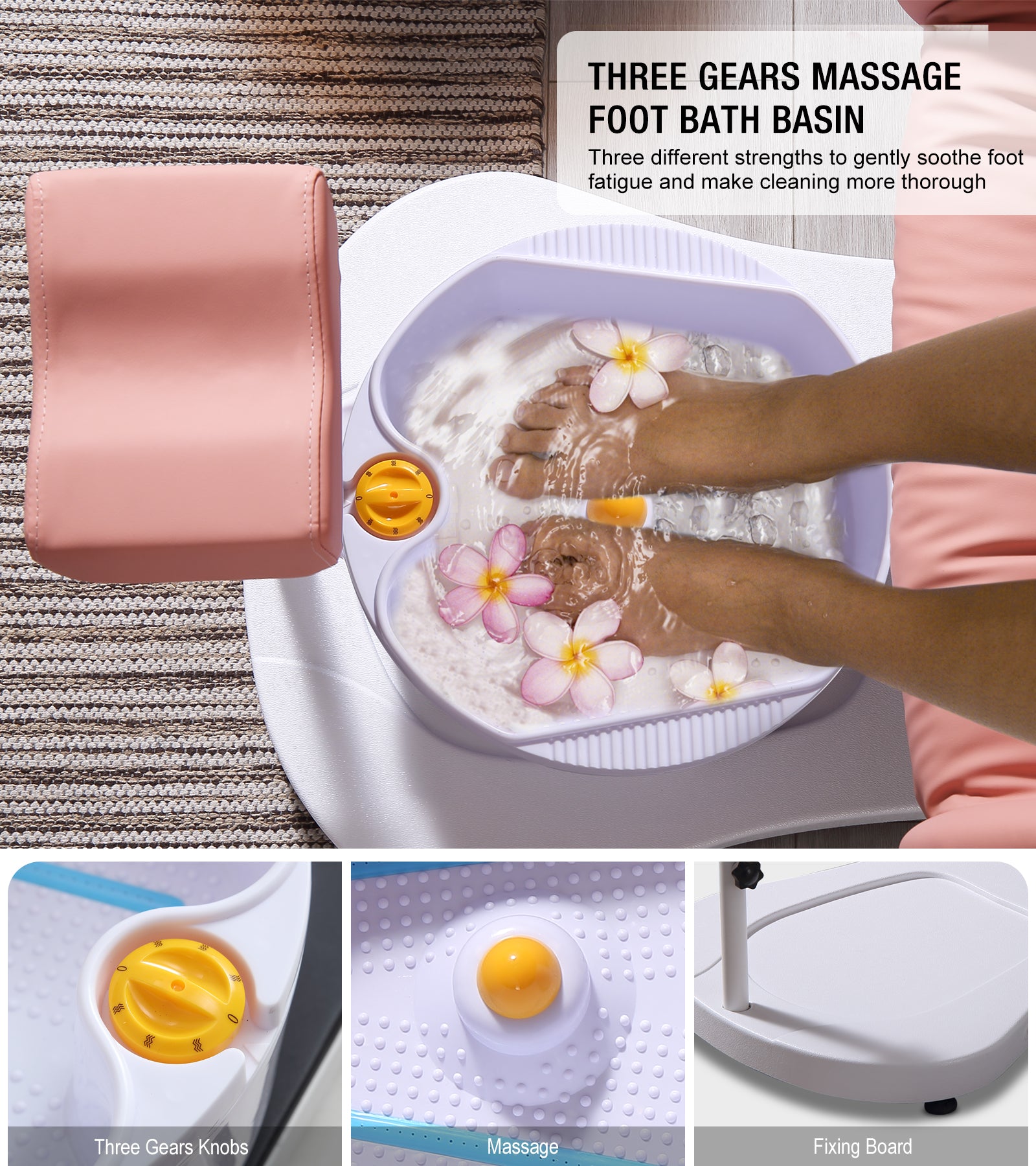 - Removable Massage Foot Basin: Our pedicure chairs no plumbing come with a 3 gears vibration massage foot basin. Micro and high frequency vibrations can effectively relax and clean feet. High temperature resistant and odor-free PP material has a longer service life. 6.5” deep basin and removable design for easy use. The grooves in the base can hold it in place