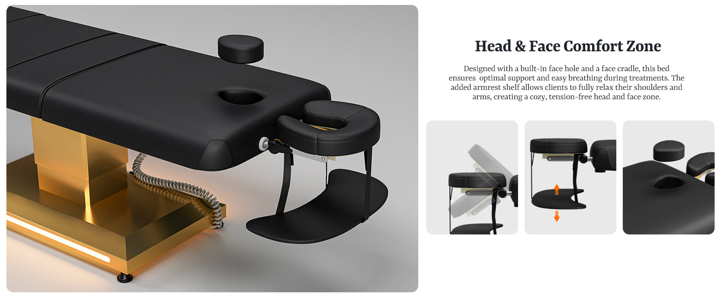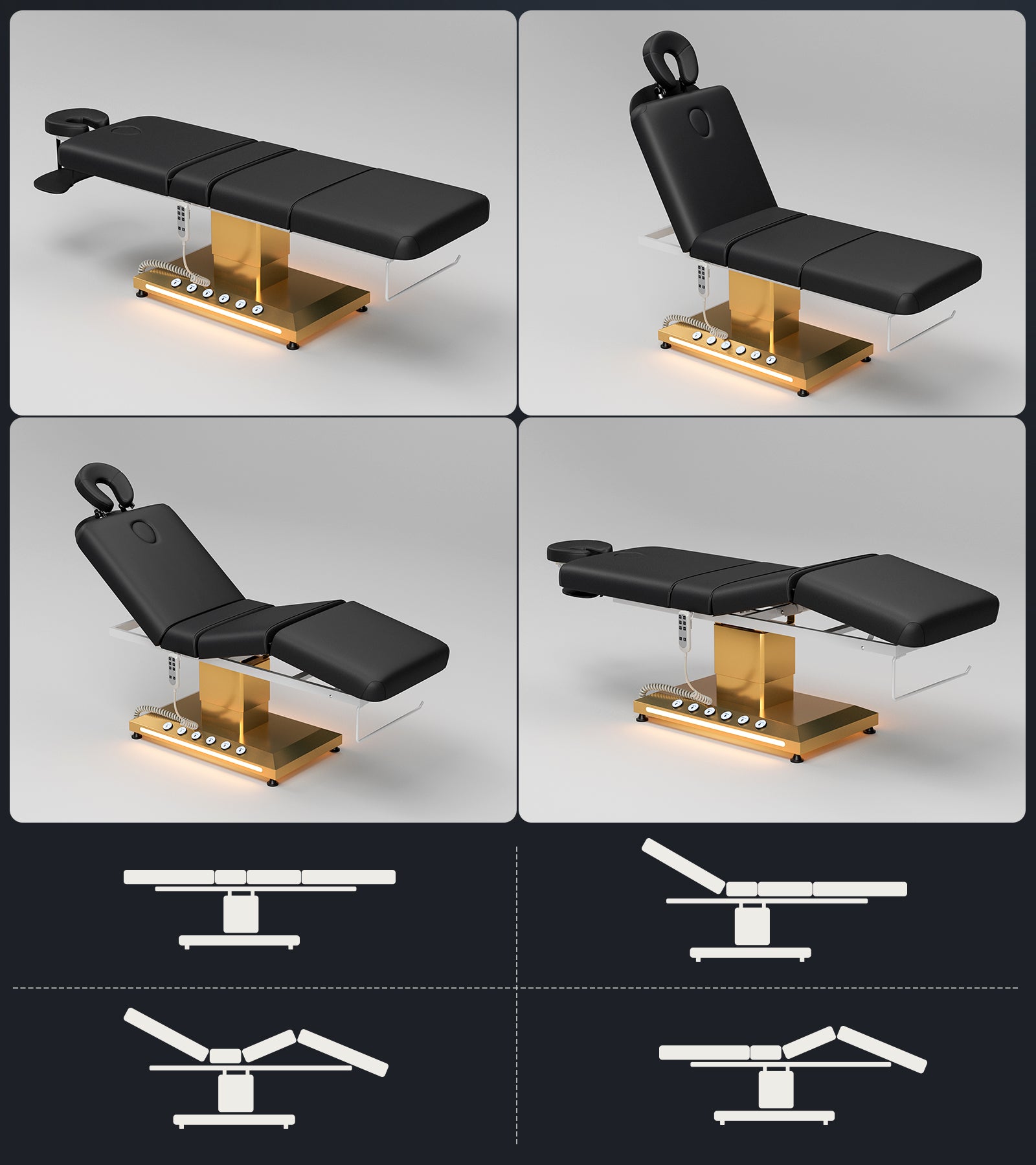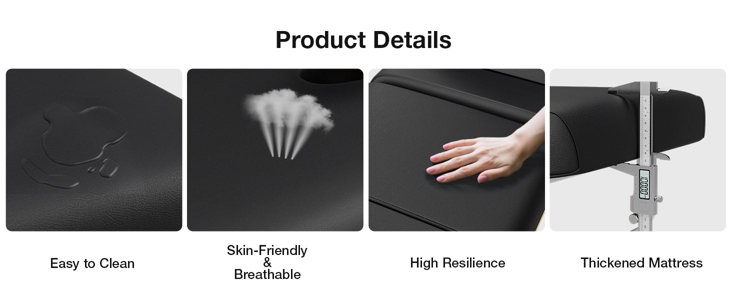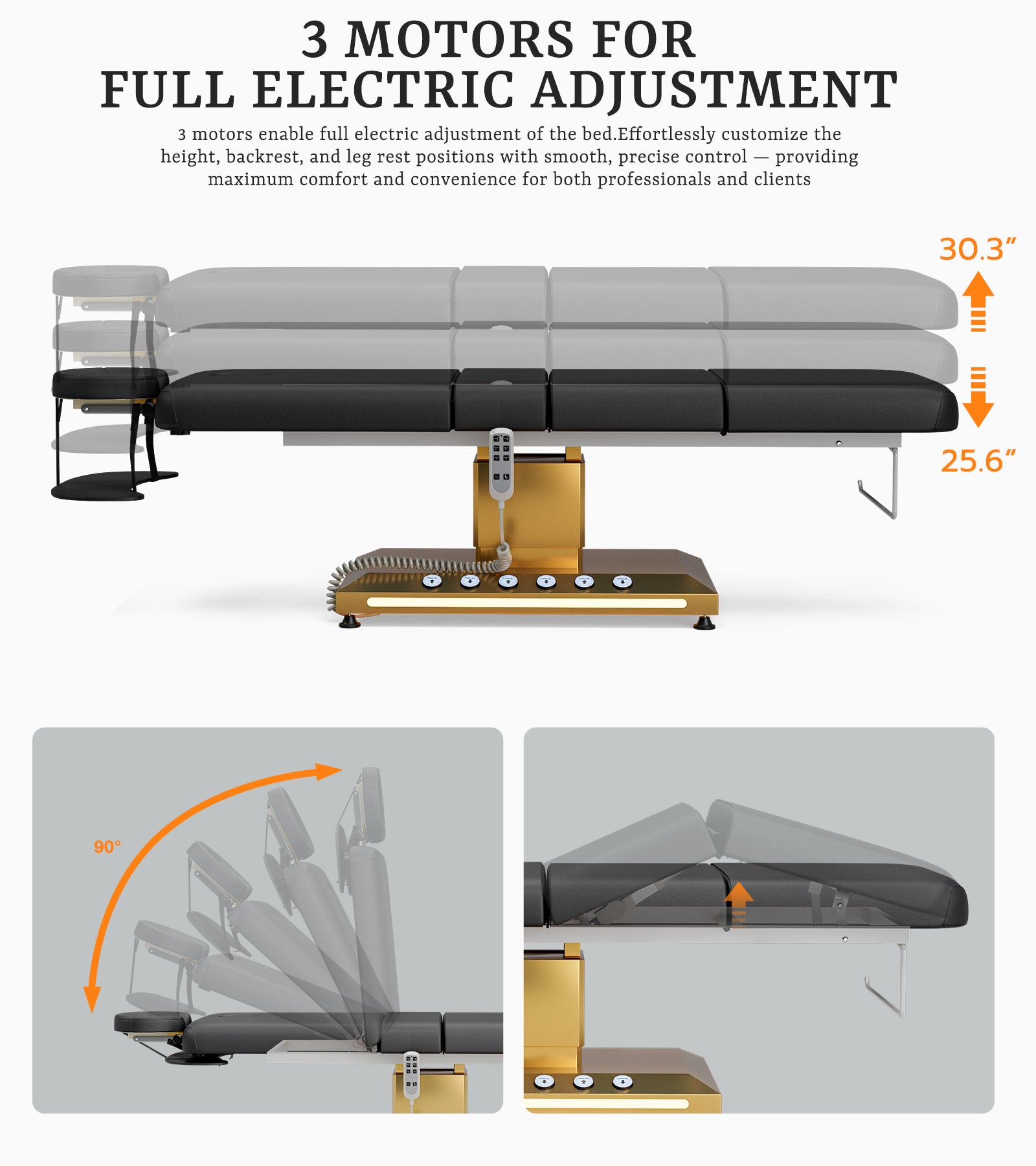 High-Performance Silent Motors: This electric beauty bed is equipped with 3 powerful motors that ensure smooth and precise adjustments to the bed’s height, backrest angle, and leg rest incline.