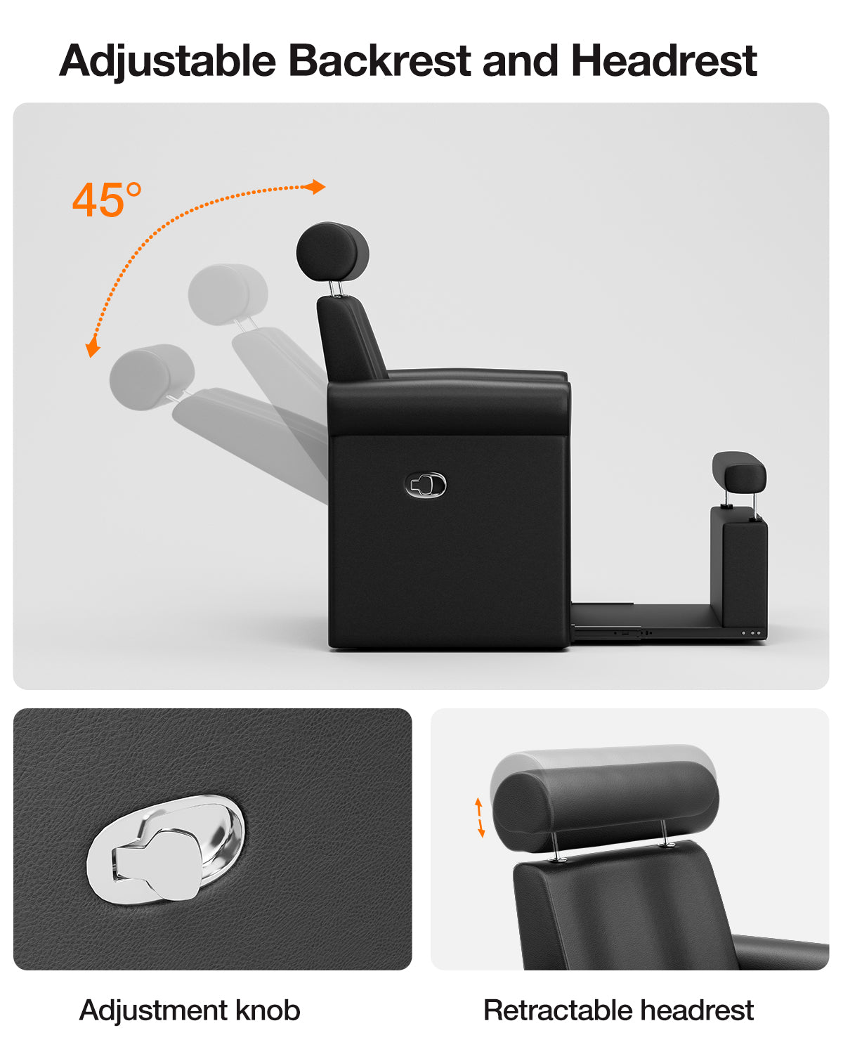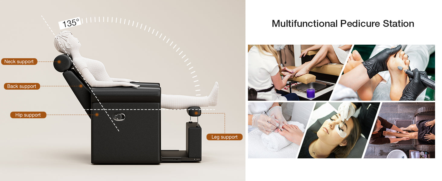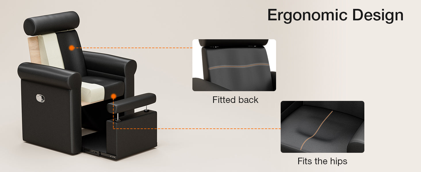 - Ergonomic Design for Comfort: This pedicure chair features an adjustable reclining backrest, retractable headrest, and footrest to help clients find a comfortable position while allowing technicians to perform pedicures efficiently. The curved armrests provide ample support, and the deep seat and wide backrest comfortably accommodate various body types