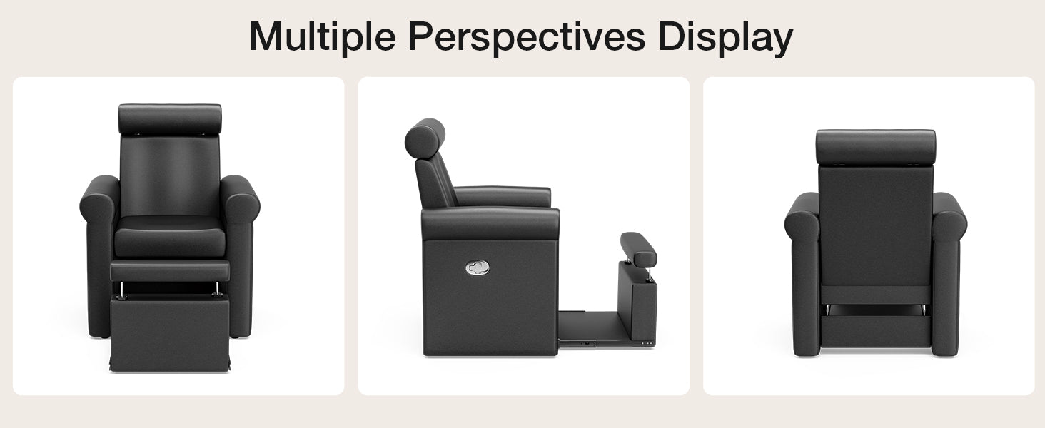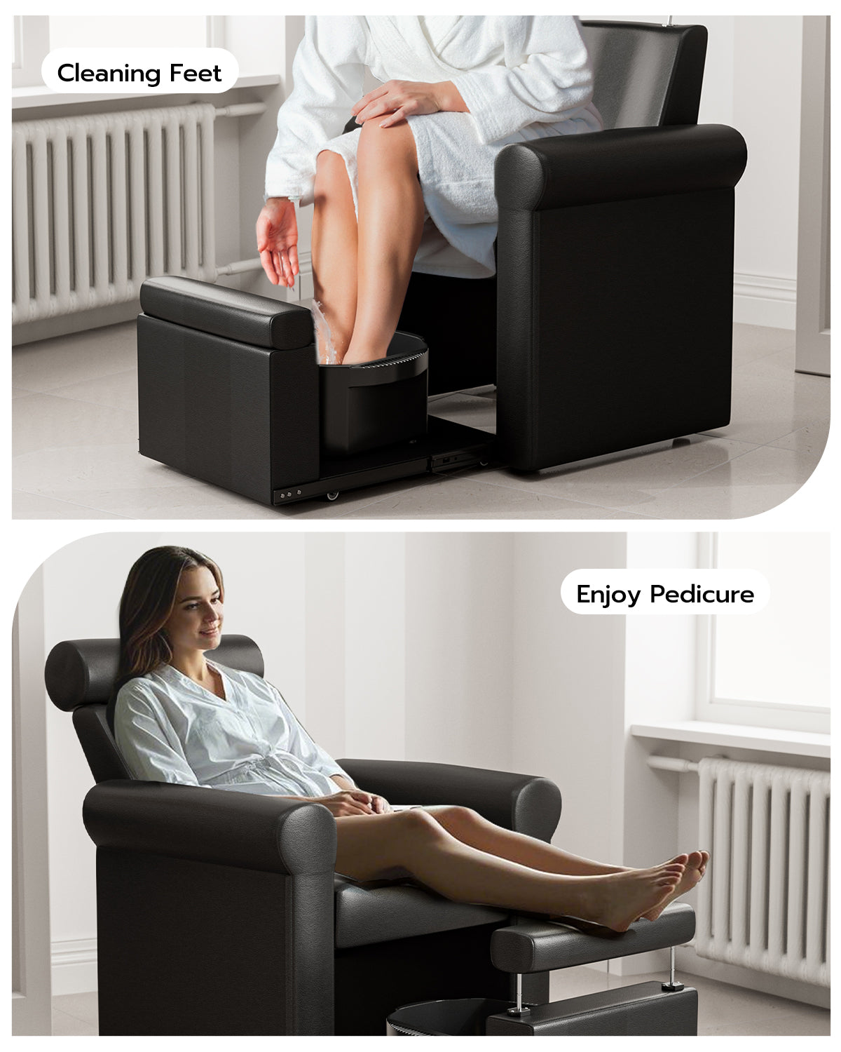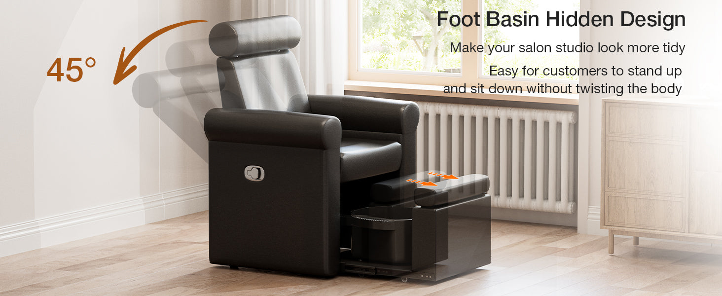 - Space-Efficient: With its retractable base and pipeless, compact design, this pedicure chair offers a neat, tidy appearance, making it an excellent choice for small salons. The base is compatible with most foot bowls on the market, eliminating the need for additional purchases or complex plumbing installations (Foot basin not included)